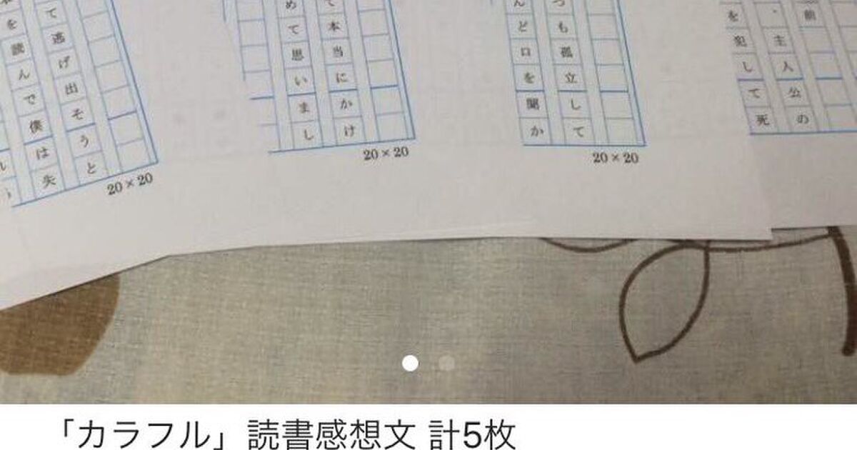 日本語・現代文・国語 カラフル 読書感想文 夏休みの宿題で読書感想文があって私ゎカラフルで書こうと思ってるんですが ぜんぜん書き方もどんな風に 書いたらいいのかもわからないんです(^_^; 読書感想文のようです。 読書感想文といえば、親子そろって悩みの種となる宿題ですね。 いったい何を書けばよいのだろう? そもそも何の本を読もう? と悩んでいるうちにあっという間に夏休が過ぎていく・・・。 タイムリミットが迫れば迫るほどあせり、